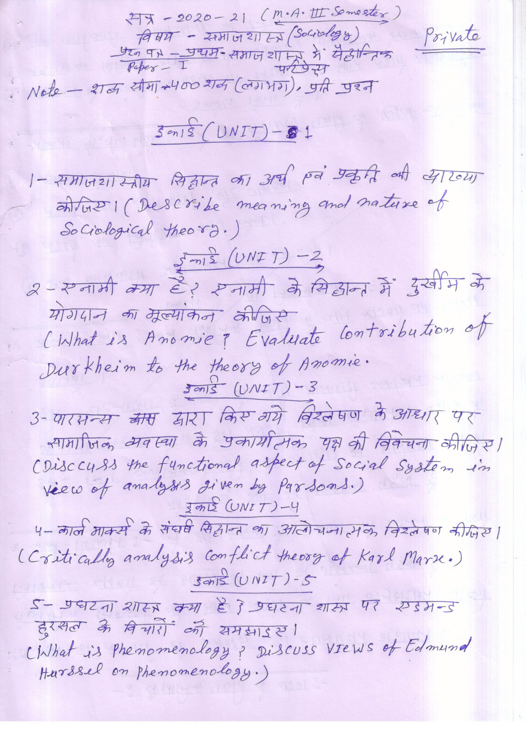 M.A. Sociology 3rd Sem Exam Dec-2020 Private Students